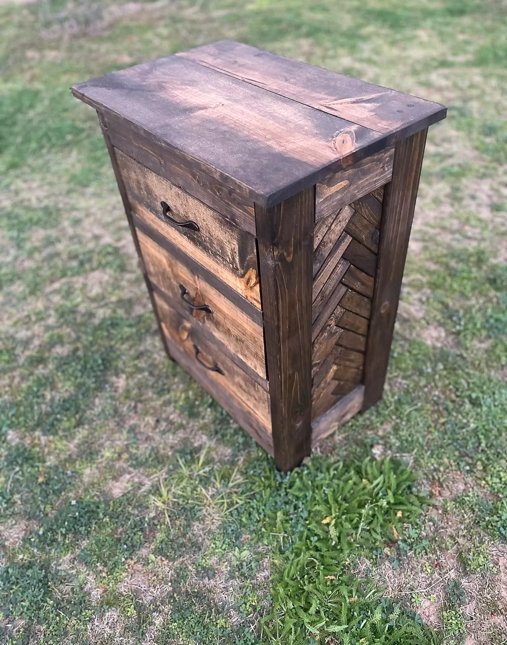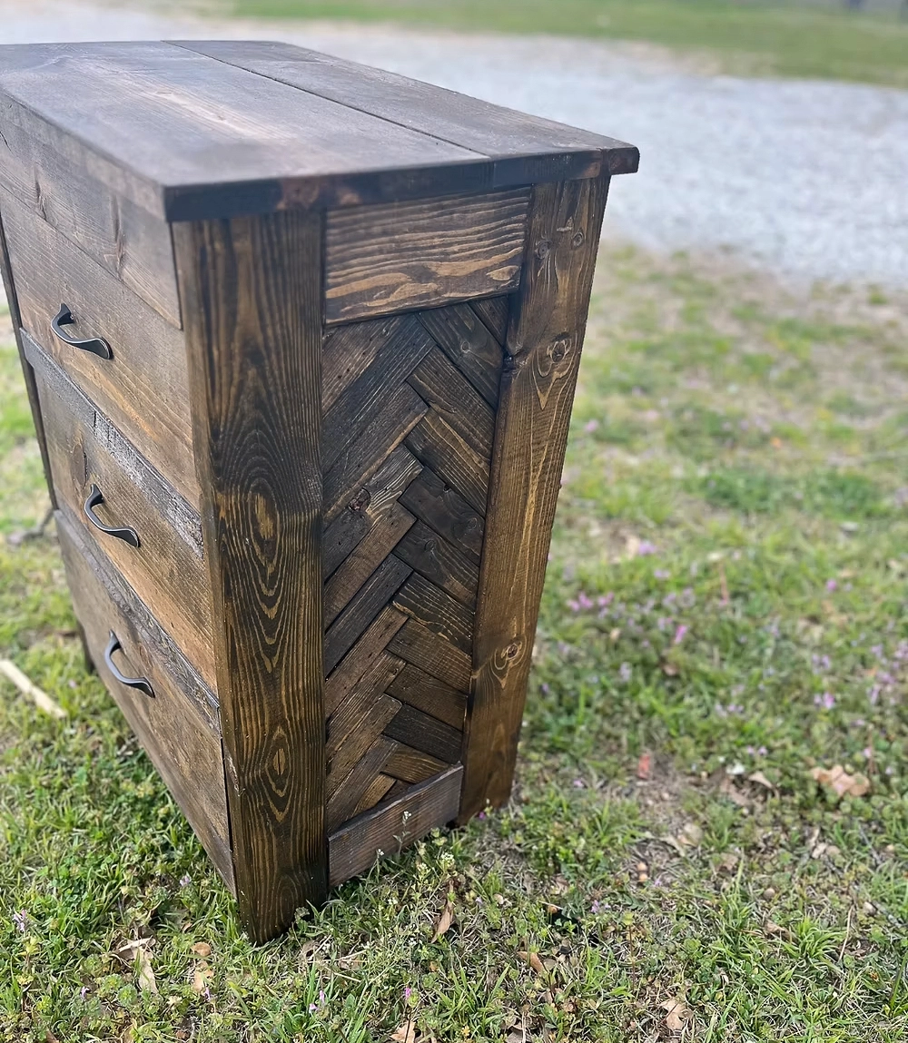The San Miguel Nightstand is designed with a classic farmhouse look. It has three drawers with a herringbone design, finished in a dark walnut color. It also comes in other colors if needed. This is a great addition to any bedroom in your home, vacation home, or rental property. All drawers on the San Miguel Nightstand slide on the proper tracks for easy and smooth use.